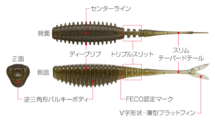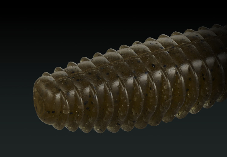 また、フックにセットする際、スリムなワームは、少しズレただけで左右の重量バランスが崩れてしまうが、太めのヘッドはズレに対する許容度が比較的大きく、セット位置によるバラツキが発生しにくいのも実戦向き。