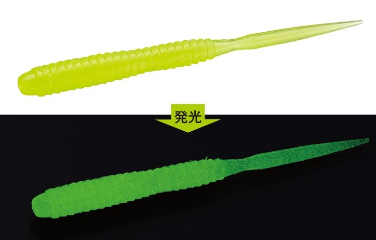 コンパクトシルエットと適度な張りのあるマテリアルによるキビキビとしたアクション・ピリピリとした波動で極小のベイトフィッシュをイミテート。大きなシルエットのワームにはアタリが無い時、アタリはあるが喰いが浅く針掛りしない時にはこのサイズの出番です。