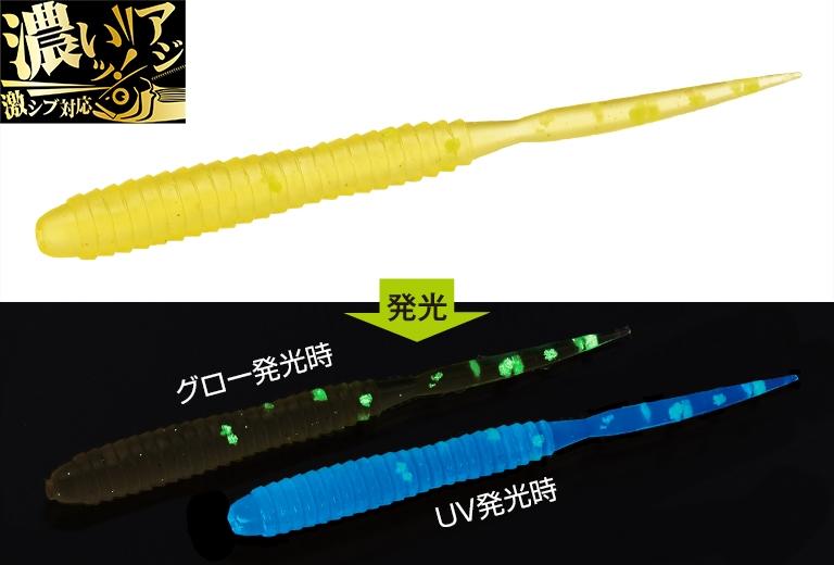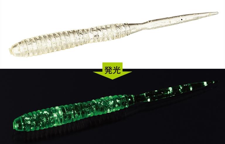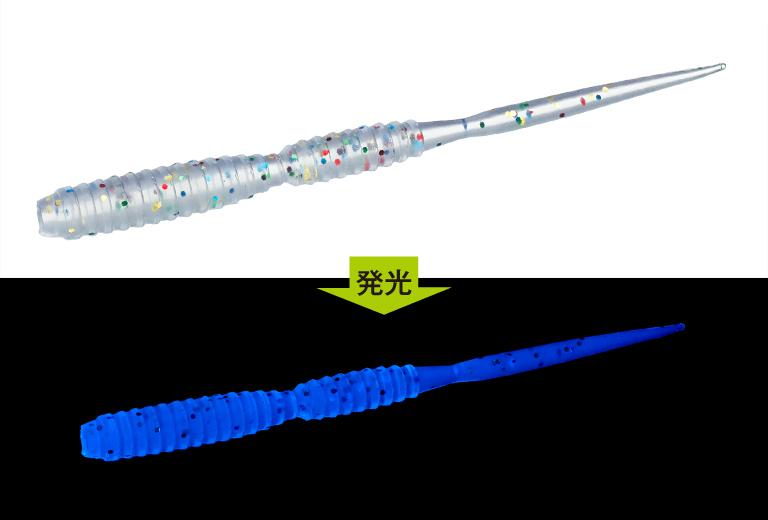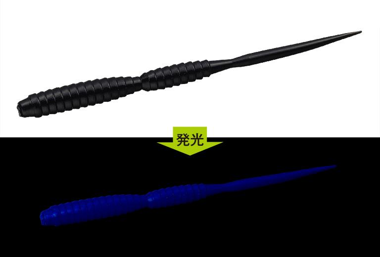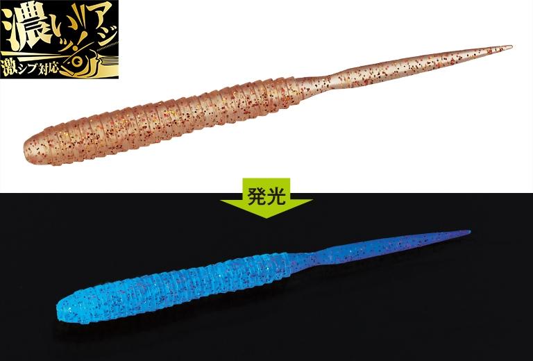ロング化に伴いボディ形状を新設計。ボディ中央にもう一つクビレを設けることでロングボディながら吸い込みは抜群。さらには2.5インチ専用の柔らかマテリアルにより、僅かな水流でテールの微振動&ボディ全体を大きくくねらせるような艶めかしいアクションを引き起します。ロングシルエットによるアピール力が欲しい大場所や、バチ等細長いベイトをターゲットが捕食している時、柔らかなボディによるゆっくりとした誘いが効く低活性時等に威力を発揮します。