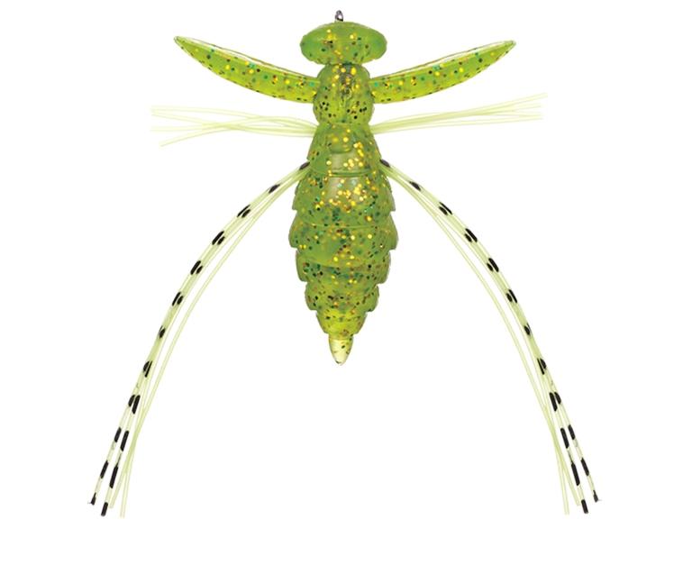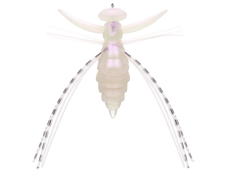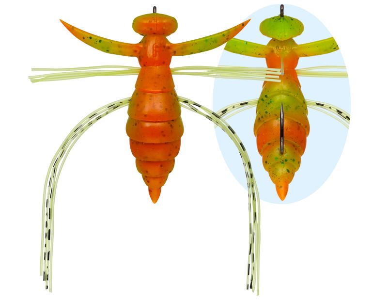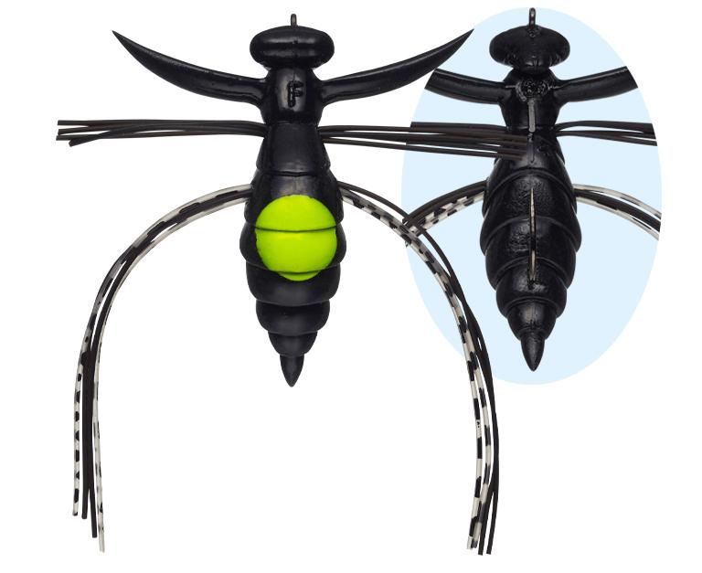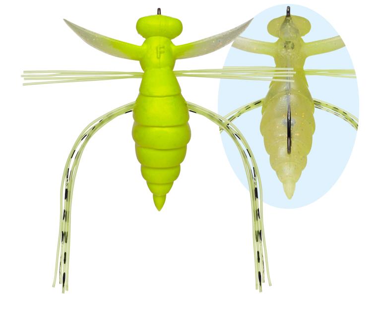リアルさだけでなく、飛びと浮き姿勢のバランスを考慮した大きめのテールデザインにより後方重心化することで飛行姿勢が安定し飛距離を確保。さらに、浮力を備えたエラストマー素材ならではのナチュラルな着水音も釣れる虫系ルアーの条件。