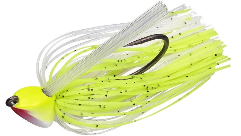なので、大き目のトレーラーや抵抗の強いトレーラーをセットしてもヘッドが傾いたり回転したりしにくくなり、どんなトレーラーとも合わせることができるため、様々な状況に対応できます。また、より速巻きにも耐えるので、スピードによるリアクションバイトを誘発する使い方もできます。一方、冬から早春の低水温期のスローリトリーブにおいても上部フラット面に水が当たり、引いているときの感度を提供してくれるので集中してやり切れます。