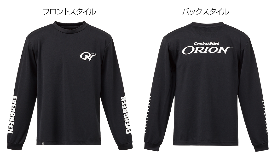 コンバットスティック・オライオンのイメージカラー・ブラックに、ホワイトのロゴプリントが映えるオライオンドライロングTシャツ。汗をかいてもベタつかずさらりと快適な着心地をキープ&洗濯後も乾きやすくシワになりにくいイージーケア。