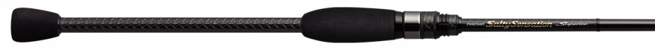 - さらに、ロングレングスの宿命、ダルさよる操作性低下を徹底排除するため、センター~バットにさらなる超高弾性カーボン素材46トンを融合。加えて、バット~グリップエンドに超軽量4軸組布・スーパーライトクワトロクロス補強を施すことで、重量増を最小限に抑えながらも剛性を高め、さらなるリフトポテンシャルを追求。ブランクスの持つ感度を最大限活かすため、ワインディングチェック部の飾り巻きを排除、バットロゴ部以外すべて無塗装アンサンドフィニッシュ。