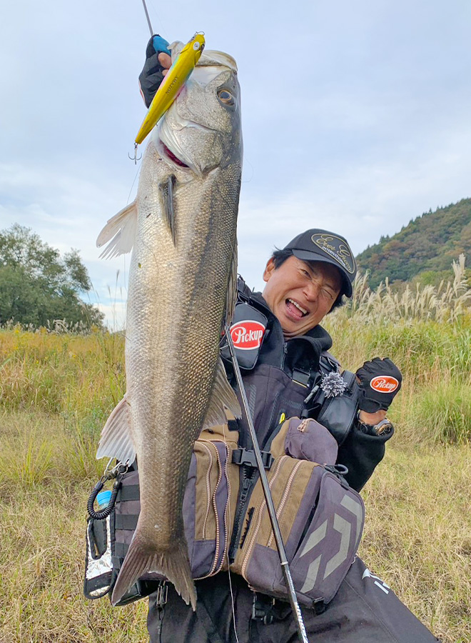 ロケ前日のポイントの下見で、ビッグペンシル・「アマゾン」のボーン素材モデルが炸裂し82cmのランカーシーバスをキャッチしていた小沼さん。