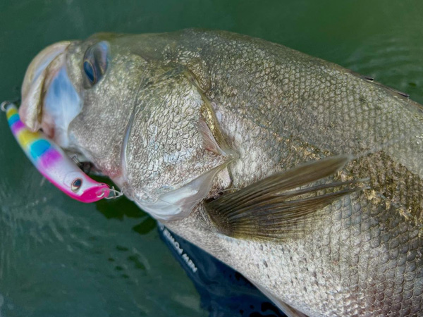 ビッグシーバスハンティングのエキスパート、フィールドスタッフ林健太郎がメータークラスの実績が最も高いと語る「細かくきらめくホロのキャンディ」を作成。さらに、明暗部のドリフトにおける視認性を高めるためヘッド部をピンクに塗装。